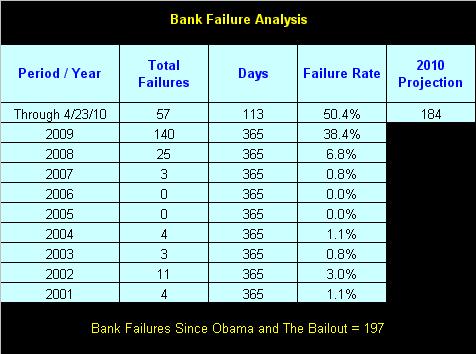 Through April 23, 2010, there have been 57 bank failures. That’s 57 in 113 days, or a failure rate of 50.4%. In 2009 there were 140 bank failures at a failure rate of 38.4%. So it’s been more than a year since the problem was ‘solved’, and the rate of bank failures has actually increased. In contrast, there were only 25 bank failures in 2008, 3 in 2007, none in 2005 or 2006, and only 22 from 2001 through 2004.