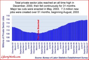 In May of 2003, tax cuts were enacted. The tax cuts were responsible for the creation of 7.3 million new jobs beginning in August of 2003 and lasting through the end of 2007 (source: http://libertyworks.com/bush-tax-cut-myths-and-fallacies-1/). Tax cuts are the only proven method for bringing an economy out of recession. The deeper the tax cut, the greater the expansion.