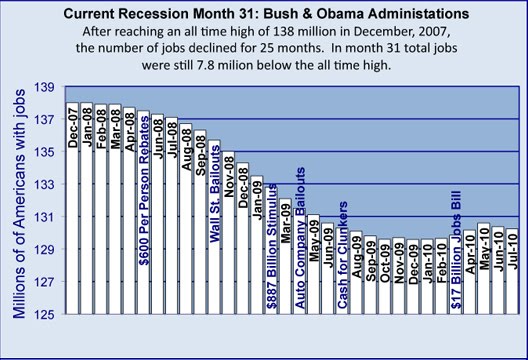As Liberty Works so aptly reminds us, “President Obama and the Democrat Congress have implemented a series of measures that defy the lessons of past recessions”, especially that of 1981, which was by some measures worse than this one. The chart below shows, “the job market recovery is faltering at best, after 31 months of Bush/Obama policies. There are 8 million fewer Americans now employed than in December, 2007.”