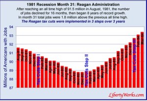 The results in the next chart, speak for themselves. “Reagan’s policies turned the job market around after 16 months of losses. The Reagan economy grew continuously for 90 months, creating a total of 21 million new jobs, or a 24% increase in the number of Americans who were employed.”