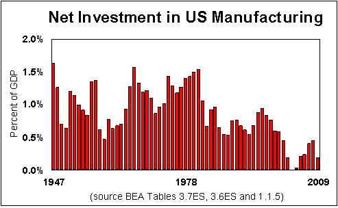 These proposals are all reasonable. But then they show a woeful misunderstanding of international economics. They advocate a combination of fixed exchange rates and every country agreeing to target for inflation. Do they really think that trade flows are determined by differences in inflation (i.e., purchasing power parity)? Do they not understand that exchange rates are determined by supply and demand in currency markets and that the mercantilist countries manipulate those markets so that they get manufacturing investment while we do not? Do they not understand that when a country gets more investment than its trading partners, its currency should strengthen, whether or not it has inflation? The following graph, shows the low level of U.S. manufacturing investment over the last decade which has caused the U.S. trade deficit to grow despite a falling dollar since 2003 and our low rate of inflation: