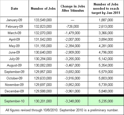In addition to creating 22 millions jobs, the Chinese government claims to have helped 1.6 million businesses, and to have saved 60 million jobs. The Obama Administration’s stimulus plan was supposed to save 1,613,000 jobs in addition to creating 1,887,000 jobs, but since it actually resulted in the loss of 3,348,000 jobs, it will now take the creation of 5,235,000 jobs, by January of 2011, to reach the original target (reference).