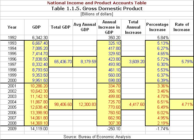 A comparison of GDP between the periods of 1993-2000 and 2001-2008 can be looked at in two ways. Static minds will focus to the far right of the table below, and pontificate that GDP grew at a higher rate, an average of 5.79% under Clinton, than the lackluster 4.71% under Bush. What they miss is found in the third and fourth columns. Comparing the total amount of gross domestic product over each term, we see that total GDP under Clinton was only $65.4 trillion, while it was $98.4 trillion under Bush. We also see that average annual GDP under Bush was $12.3 trillion, while under Clinton it was a mere $8.2 trillion. In other words, total economic production grew by 50.4% during an era of lower tax rates.