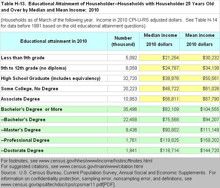 According to the U.S. Census Bureau, household income is a product of one’s level of education. It’s a fact that households with a Bachelor’s Degree, or greater, earn higher incomes. So if you want more income, you better finish college, otherwise, be happy with what you get, because it could be a lot worse. After all, this isn’t the 3rd world. American’s know the drill, and we make the choices that we need to make, to get where we want to be. And if we fall short, we push our children forward.