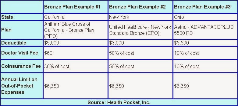 In Pennsylvania a Bronze plan for a 55 year old man and a 54 year old wife costs a little under $900 per month, has a $10,000 deductible and 20% copay.