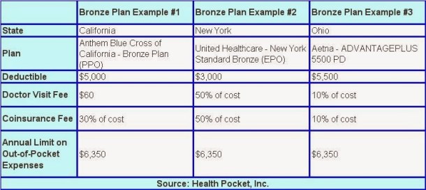 Out-of-pocket expenses include fees like deductibles, copayments, and coinsurance. Different plans will approach the 40% or more that policy owner’s will pay in various ways, so it is important to research the financial details of a specific plan before deciding which one to purchase. For example, a person who has frequent medical expenses may want a Bronze Plan with a lower deductible, because they will be required to pay at least that much of their annual health care expenses – in full.