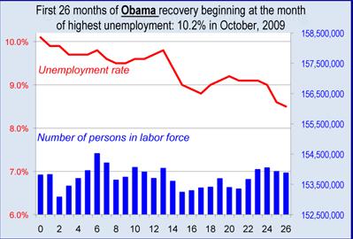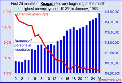 The second chart above tracks the first 25 months of the Reagan recovery of the 1980s. President Reagan inherited a sick economy and a deep recession that by most measures was worse than what President Obama inherited.  As the chart shows, the unemployment rate soared even higher but then there was a steep drop even as the labor force grew by 4.3 million!  People did not give up looking for jobs during the Reagan boom because there was robust growth in the economy and employers were creating hundreds of thousands of jobs every month.