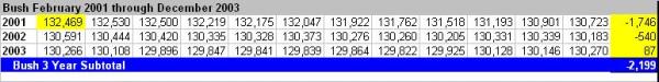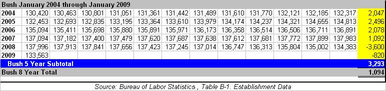 By comparison, George W. Bush, who also inherited a recession from his predecessor, suffered total job losses of -2,199,000 by the end of his third year in office (see table below), while Obama lost -1,663,000 during his first three years (see table above).
