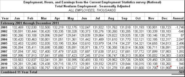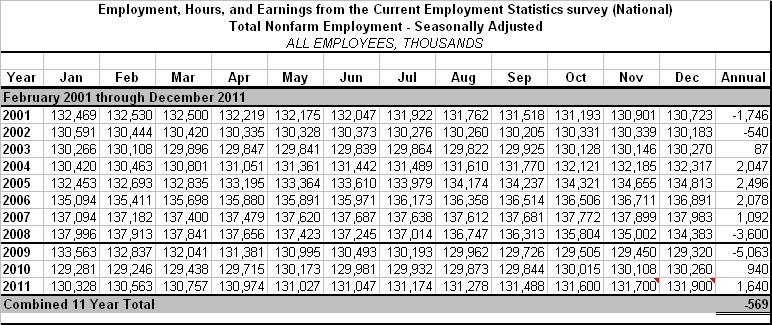 To find out, we took a closer look at the official data published yesterday by the Bureau of Labor Statistics (BLS). According to Table B-1, Establishment Data, the American economy has lost a total of -569,000 non-farm jobs since January of 2001. So in terms of jobs growth, what is factual is that not one new net job has been realized over the last 11 years (see table below). So are we headed in the right direction? I am reminded of a quote from the movie “2012” – “When they tell you not to panic, that’s when you run.”