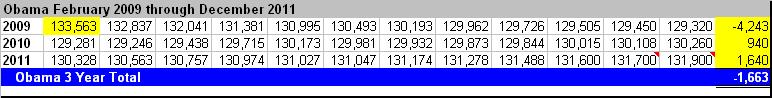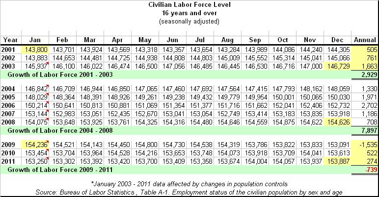 The table above shows the number of Americans counted as part of the labor force, from 2001 through 2011. It does not include those considered, “not in labor force”. You can see that during Bush’s first three years in office, although the economy was in recession, the labor force grew by 2,929,000 (on a seasonally adjusted basis). In contrast, the labor force has contracted by 739,000 during Obama’s first three years.