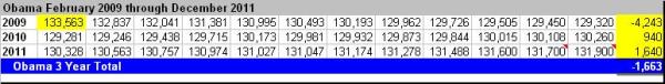 The Bottom Line: Obama has lost a total of -1,633,000 net jobs since he entered office. Not one new net job has been gained since the year 2007. The percentage of unemployed, plus marginally attached and discouraged workers stands at 10.5% as of December 2011, versus an average of 5.5% to 7.0% during the prior eight years. The civilian labor force has contracted by -739,000 workers since January of 2009, for an average loss of -246,333 per year, versus average growth of 1,304,500 per year in the eight years prior to Obama. So perhaps, Obama’s latest fabrication isn’t all it’s cracked up to be.