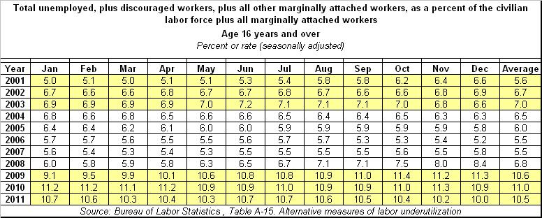 Now we will turn attention to the unemployed, and the uncounted, marginally attached and discouraged workers. You will note in the data from BLS Table A-15, Alternative Measures of Labor Utilization, (below) that during Bush’s first three recessionary years, the percentage of unemployed, plus marginally attached and discouraged workers averaged between 5.6% and 7.0%. You can also see that during Obama’s first three years, the rate has jumped to an average of between 10.5% and 11.0%. In fact, as of December 31, 2011, a larger percentage of Americans are unemployed, discouraged, or marginally attached to the labor force than at anytime since 1994 (when the statistic was first measured). So does this hidden fact somehow back up the words, “we are moving in the right direction”? Only if the direction Obama is espousing entails enslaving millions more to lives of perpetual government dependency. We’ve seen brighter mornings.