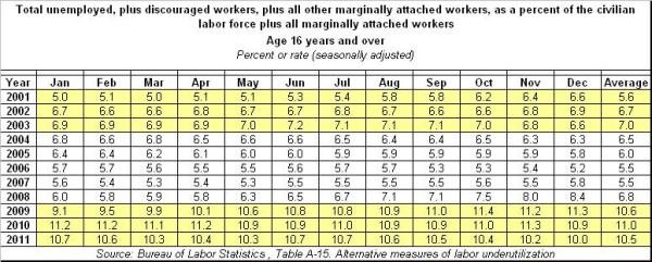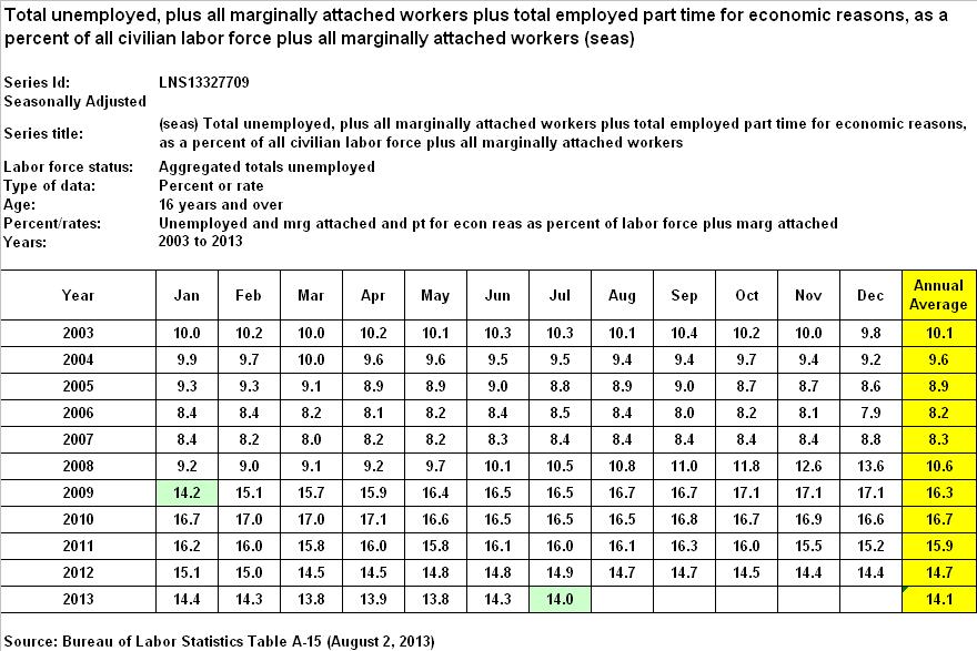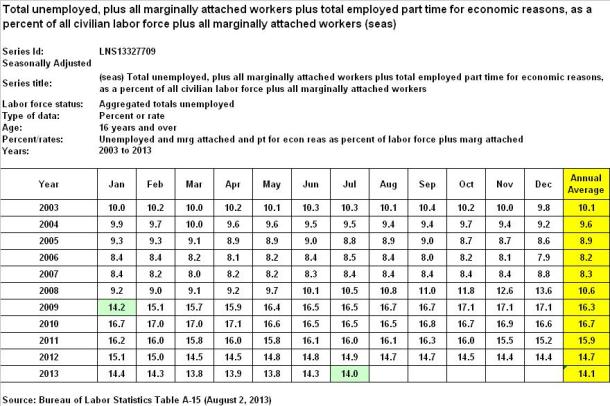 When it comes to the federal government’s broadest measure of unemployment, U-6, according to the BLS the rate was 14.2% for January 2009, peaked at 17.1% in October through December of 2009, once again in April of 2010, and has since declined to 14.0%, as of July 2013. A closer look reveals the following annual averages, since 2003: