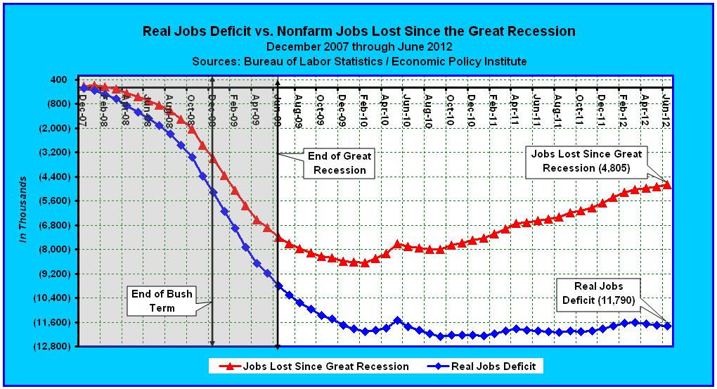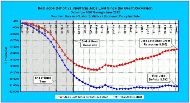Since the beginning of 2009, the net result of Obama’s anti-success rhetoric, coupled with the most reckless deficit-spending record in U.S. history, has been an increase of 6.5 million workers who are no longer counted as part of the labor force. And on top of this, the economy has lost 1.7 million jobs, since February of 2009. The real unemployment rate isn’t 8.5%, it’s somewhere between 12.0% and 41.6%, perhaps even higher, depending upon one’s perspective.