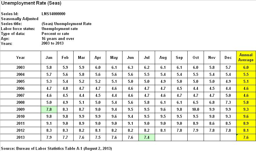According to BLS, the official U-3 unemployment rate was 7.8% for January of 2009, peaked at 10.0% in October of 2009, and has since declined to 7.4% as of July 2013. A closer look reveals the following annual averages, since 2003: