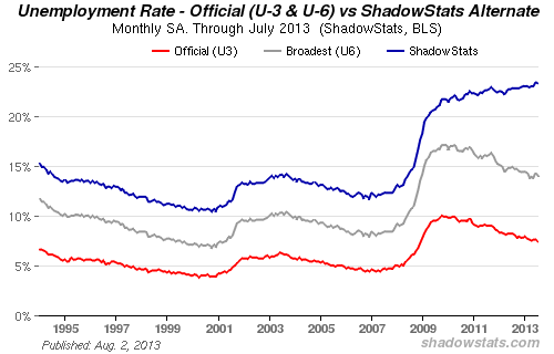 Every month, the BLS publishes its official U-3 unemployment rate, a headline number that almost everyone is familiar with, but also releases the lesser known U-6 unemployment rate, its broadest measure of unemployment. U-6 includes short-term discouraged and other marginally-attached workers as well as those forced to work part-time because they cannot find full-time work. When we compare current BLS statistics, which are based on a flawed methodology only in place post-1993, against its pre-1994 methodology, we discover that the official U-3 rate is really closer to 12.8%, not the 7.4% figure published on August 2, 2013, and that the broader U-6 rate is really closer to 23.3%, rather than 14.0%.