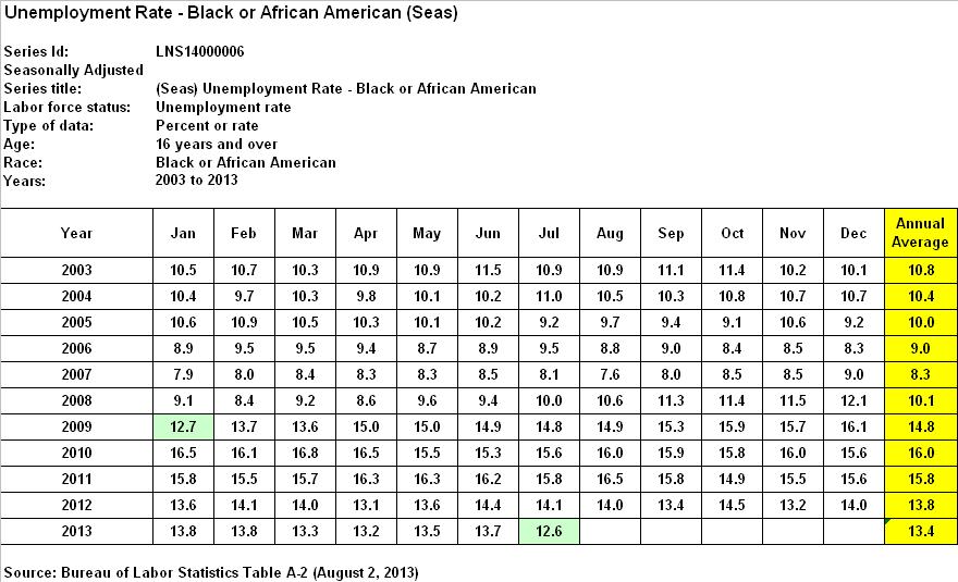 According to BLS, the official unemployment rate for Black Americans was 12.7% for January 2009, peaked at 16.8% in March of 2010, and is currently 12.6%, as of July 2013. A closer look reveals the following annual averages, since 2003: