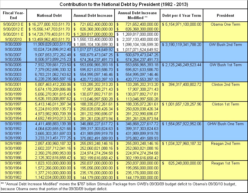 4. George W. Bush exploded the Debt by $5.31 trillion over 8 years. Although I would come to trust GWB with my life, I wouldn’t trust him with my wallet. To be fair, I have deducted Obama’s fiscal year 2009 addition of $787 billion for his failed Stimulus program, and I added it to Obama’s 2010 deficit. I would also attribute $2.1 trillion of Bush’s $5.31 trillion in red ink to Nancy Pelosi, and the majority Democrat Congress.