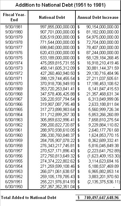 What’s striking is the fact that only a total of $740.5 billion was added to the Debt between fiscal years 1951 through 1981 (see table below).