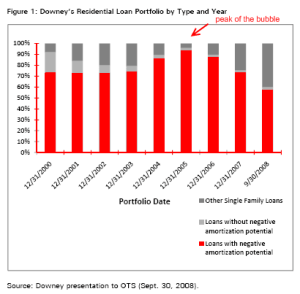 Downey by the end of 2005 at the height of the bubble had 91 percent of its single family home loan portfolio in option ARMs. They basically went 100 percent with this toxic product. 73 percent of Downey’s option ARMs had negative amortization potential which of course did occur and imploded the bank. Just take a look at this stunning chart: