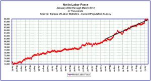 In order to know the truth, we must examine not so much monthly trends in employment, but rather changes which have occurred from the end of January 2009 through March 2012. When we examine the entire record, we find that our economy hasn’t created any jobs at all over the past 3 ¼ years, on a seasonally adjusted basis. Instead the unemployment rate has risen from 7.8% to 8.2%, the number of nonfarm jobs has declined by 740,000, the number of unemployed persons has increased by 624,000, and total employment has declined by 153,000. Meanwhile, the working age population has grown by 7,865,000, while the civilian labor force has only managed an increase of 471,000, causing the number of persons no longer counted in the labor force to balloon by 7,395,000.