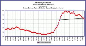 The unemployment rate rose from 7.8 percent in January of 2009 to 8.2 percent as of March 2012, according to the U.S. Bureau of Labor Statistics (Employment Situation 4/6/2012). (See table A-1 / Seasonally Adjusted)