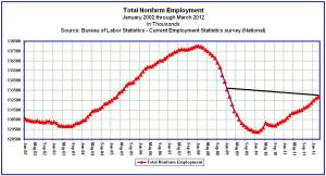 Nonfarm payroll employment declined by 740,000 through March of 2012, from 133,561,000 in January of 2009 to 132,821,000. (See table B-1 / Seasonally Adjusted)