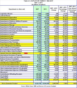 Does the following condensed OMB table, Outlays by Agency, which compares government spending growth from 2007 to 2011, raise any flags? If you ask me, the entire record is a red flag. The General Services Administration is an obvious bell ringer, its expenditures having grown from $27 million in 2007, to over $1.8 billion in 2011, or by 6,896.30%. But it’s not the only agency that should concern us, frankly they all should.