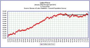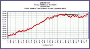 The labor force increased by 471,000 through March of 2012, from 154,236,000 in January of 2009 to 154,707,000. The labor force hasn’t grown at all since October of 2008. (See table A-1 / Seasonally Adjusted)