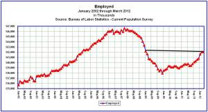The number of persons employed declined by 153,000 through March of 2012, from 142,187,000 in January of 2009 to 142,034,000. (See table A-1 / Seasonally Adjusted)