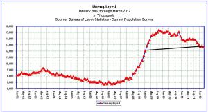 The number of unemployed persons increased by 624,000 through March of 2012, from 12,049,000 in January of 2009 to 12,673,000. (See table A-1 / Seasonally Adjusted)