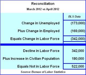 The number of persons counted as ”Not in Labor Force” increased by 522,000 in April, which is the sum of the 342,000 persons who were previously counted as unemployed (173,000) and employed (169,000), plus the 180,000 new working age persons who were swept under the rug.