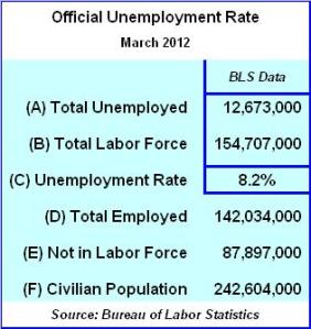 As shown in the table below, at the end of March 2012, 12,673,000 persons were officially unemployed, out of a labor force totaling 154,707,000, equaling an unemployment rate of 8.2%. Got it?