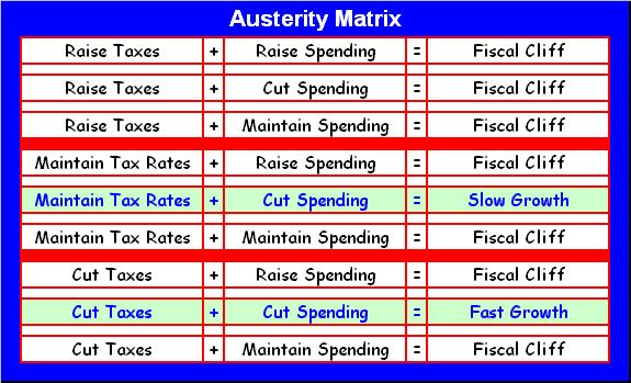 The optimal fiscal austerity policy involves a combination of tax cuts and deficit reduction, which leads to rapid growth, or exactly what is needed following an economic crash. But, cutting taxes while maintaining or increasing spending levels only hurtles us over the fiscal cliff.