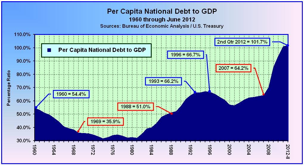 On September 14, 2012, Egan-Jones Ratings Co. downgraded its United States sovereign rating to AA (-) from AA on concerns that the Fed’s new round of quantitative easing, or QE3, will hurt the U.S. economy. In a note, the ratings agency said, “From 2006 to present, the US’s debt to GDP rose from 66% to 104% and will probably rise to 110% a year from today under current circumstances; the annual budget deficit is 8%. In comparison, Spain has a debt to GDP of 68.5% and an annual budget deficit of 8.5%.”