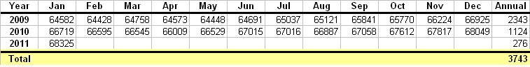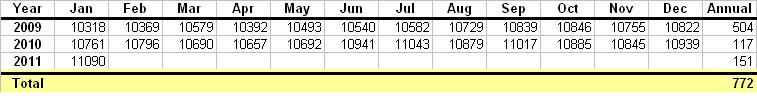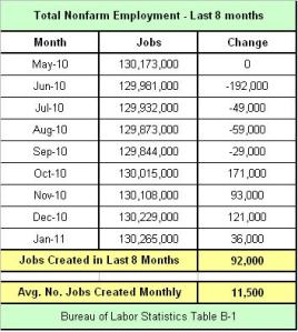 Using the same criteria as originally outlined by Obama’s (now former) economic team, jobs are defined by counting the total non-farm employment, from Table B-1 of the Bureau of Labor Statistics, “Employment Situation Report” (as seasonally adjusted). Instead of boring you with the month-by-month data, I went ahead and cut to the chase, skipping from December of 2009, where Mr. Kendall left off, to January of 2011, up to the latest data available from the 02/04/2011 jobs report.