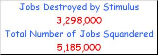 According to my previous post which is based on data which is publicly available from the Bureau of Labor Statistics, through January of 2011 the Stimulus Bill has resulted in a loss of 3.3 million jobs, and that is in addition to the number of jobs lost from the beginning of the recession until that time. The total number of jobs lost or squandered under the policies of the current White House occupant has been 5.19 million.