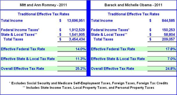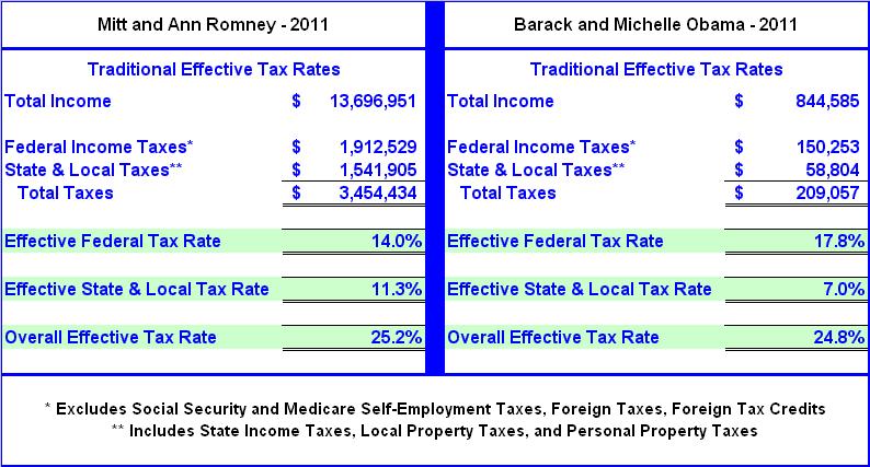 Under the traditional model, in 2011, Mitt and Ann Romney paid an effective federal tax rate of around 14.0% (see definitions at the end), while Barack and Michelle Obama paid 17.8% (see table below). So does that mean the Obamas are more patriotic? Before you answer that, consider that the Romneys paid a total of $1,912,529 in federal income taxes, versus the Obamas $150,253. So does this give the Romneys the upper hand?