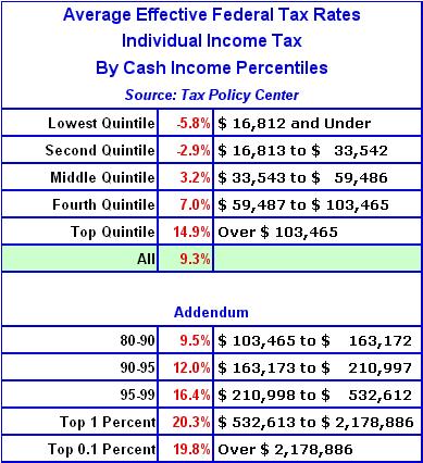 And according to The Tax Policy Center, the average effective federal tax rate for all Americans, as a percentage of cash income, was only 9.3% in 2011. Those in the Top 20 Percent (with incomes over $103,465) paid an average of 14.9%, while those in the Bottom 20 Percent (with incomes below $16,812) received back refundable tax credits averaging 5.8% of their incomes.