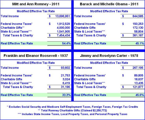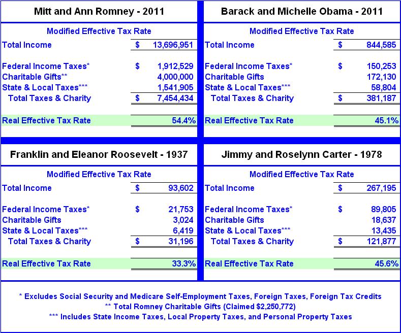 So what’s the point? First of all, we learned that in 2011, the Romneys paid a total of $3,454,434 in federal, state and local taxes, while the Obamas paid $209,057. When state and local taxes were added to the mix, we found that the Romneys paid an overall effective tax rate of 25.2%, versus the Obamas 24.8%. But when charitable contributions were figured in, we discovered that the Romneys paid a real effective tax rate of 54.4% compared to the Carters 45.6%, the Obamas 45.1%, and the Roosevelts 33.3%.
