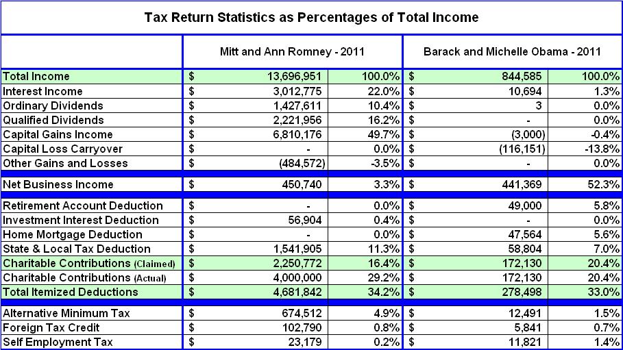 Now when it comes to charitable contributions, as stated earlier, the Romneys gave $4,000,000, or around 29.2% of their income, while the Obamas gave $172,130, or 20.4%. But since the Romneys only chose to write-off $2,250,772, their actual deduction amounted to just 16.4% of their income. So once again the Obamas had a slight advantage, yet when their total itemized deductions are compared, we find that the Romneys amounted to 34.2% of their income, while the Obamas amounted to 33.0%, or about the same.