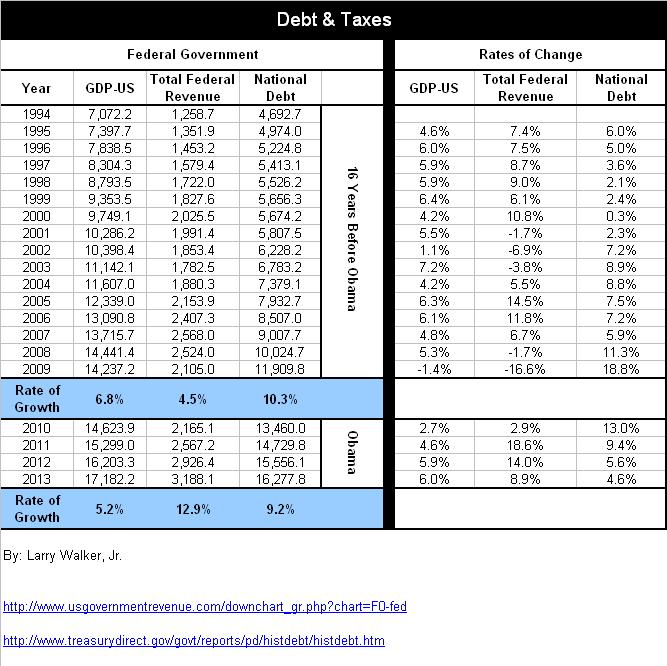 In following Obama’s budget projections for the four year period ending in fiscal year 2013, GDP will grow at an average annual rate of 5.2%, while government revenues (taxes) will grow at 12.9%, and the national debt will grow at 9.2%. Summary: Tax revenues will more than double the pace of economic growth, while the national debt will continue to grow faster than the economy.
