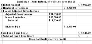 Finally, if one-half of your Excess Adjusted Gross Income (defined as adjusted gross income minus the following limits), plus the nontaxable portion of your pensions is greater than the initial amount of the credit, you are also disqualified.