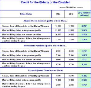 A couple of weeks ago I wrote about how during this year’s continuing education courses it suddenly dawned on me that the base amounts used in calculating the taxability of social security benefits are exactly the same in tax year 2012 as they were in 1985. Well here’s another example of elder abuse. Congress has failed to inflation adjust the limitations on the Credit for the Elderly or the Disabled since it was last upgraded back in 1984. I am frankly surprised that this credit is still around, since in its present form it’s completely useless to 99.999% of taxpayers. Why is it still taking up space in IRS instruction booklets?