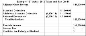 And there’s another problem. Because the standard deduction for a single person over the age of 65 in 2012 is $7,400 [5,950 + 1,450], and the personal exemption allowance is $3,800, your adjusted gross income must be greater than $11,200 to even have an income tax liability. In other words, if your adjusted gross income is under $11,200, you don’t qualify. But if your AGI is between $11,200 and $17,500, and the nontaxable portion of your social security benefits is less than $5,000 (item #1 (b)), then you might qualify.