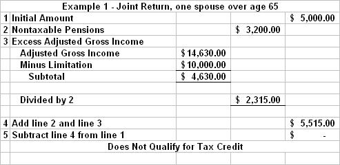Finally, if one-half of your Excess Adjusted Gross Income (defined as adjusted gross income minus the following limits), plus the nontaxable portion of your pensions is greater than the initial amount of the credit, you are also disqualified.