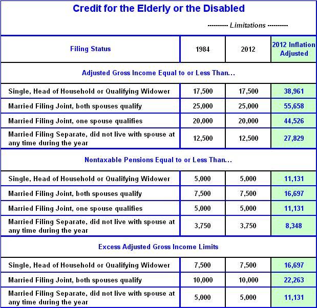 A couple of weeks ago I wrote about how during this year’s continuing education courses it suddenly dawned on me that the base amounts used in calculating the taxability of social security benefits are exactly the same in tax year 2012 as they were in 1985. Well here’s another example of elder abuse. Congress has failed to inflation adjust the limitations on the Credit for the Elderly or the Disabled since it was last upgraded back in 1984. I am frankly surprised that this credit is still around, since in its present form it’s completely useless to 99.999% of taxpayers. Why is it still taking up space in IRS instruction booklets?