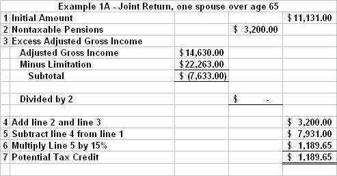 Example 1 (before) – You are 66 years old and your spouse is 64. Your spouse is not disabled. You file a joint return on Form 1040. Your adjusted gross income is $14,630. Together you received $3,200 from social security, which was nontaxable. You figure your credit as follows: