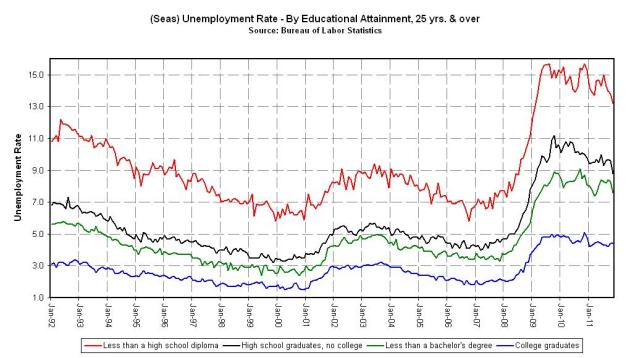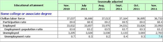 Next, according to the BLS, the unemployment rate among those 25 years of age and over who are high school graduates was 8.8%, which is still rather high, while the labor force participation rate was 60.3%. That means that while some 33.8 million in this category were employed, another 3.3 million were considered unemployed. Note: It’s curious that the overall unemployment rate dropped from 9.0% in October 2011 to 8.6% in November of 2011, primarily due to the fact that 315,000 workers dropped out of the labor force, and that the civilian labor force among high school graduates — with no college, fell by 302,000. Is this just a coincidence?