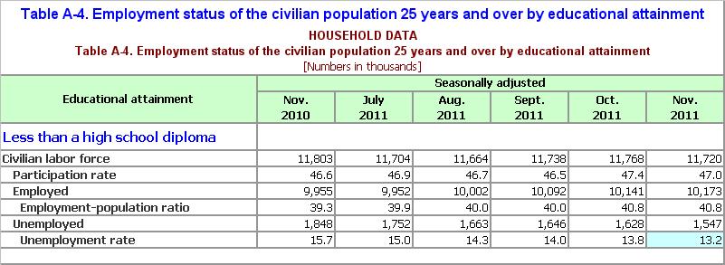 The following table, courtesy of the BLS, was split up into four parts, mainly due to the overall size, but also to focus on the characteristics of each category. First, as of November of 2011, the unemployment rate among those age 25 and over who have attained less than a high school diploma was a colossal 13.2%, while the labor force participation rate was a mere 47.0%. That means that while some 10.2 million in this category were employed, another 1.5 million were unemployed, and that there were another 13.2 million people somewhere out there who never made it through high school. Although this is the smallest of the four categories, one’s chances of employment are greatly diminished by not finishing high school.